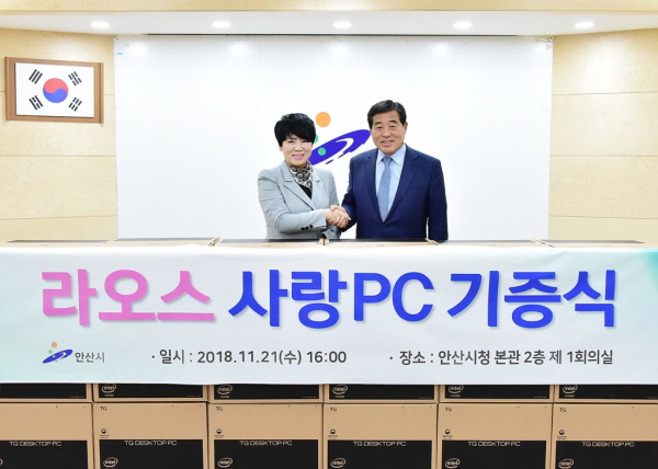 안산시는 지난 21일 시청 1회의실에서 열악한 인터넷 환경으로 정보화 교육 기회가 부족한 라오스 학생들에게 개인용 컴퓨터를 기증했다. ‘사랑의 PC’로 명명된 이번 사업은 노후 PC를 사전 정비 및 업그레이드로 성능을 향상시킨 후 정보 소외계층이나 정보 소외국가에 보급하는 것으로, 자원 재활용 및 정보 격차 해소를 위해 추진하고 있다.