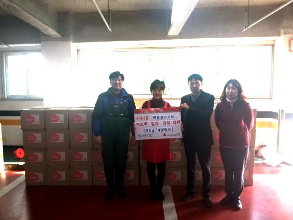 20일에는 만수2동 행정복지센터에서 ‘사랑의 김장김치 전달’ 행사가 관내 석천제일교회와 벧엘감리교회의 후원을 받아 관내 독거노인 등 취약계층 가정 130세대에 130박스의 김장김치를 전달했다.