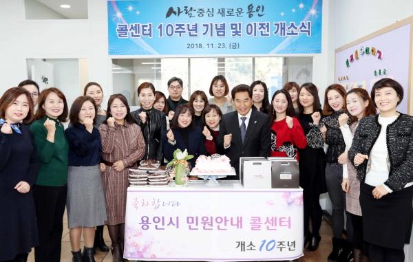 용인시는 23일 시청5층에서 백군기 용인시장을 비롯한 간부공무원과 콜센터 관계자, 상담사 등 40여명이 참석한 가운데 민원안내 콜센터 이전 개소식 겸 10주년 기념행사를 열었다.