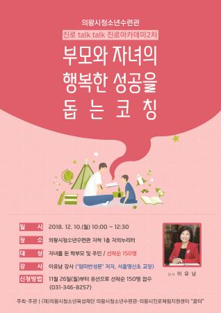 의왕시청소년수련관 및 의왕시진로체험지원센터‘꿈터’는 오는 12월 10일 오전10시 청소년수련관 자의누리터에서 학부모들을 대상으로 ‘진로 Talk Talk 진로아카데미’를 개최한다.