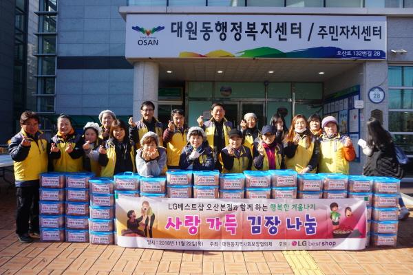 오산시 대원동 지역사회보장협의체는 지난 22일 대원동 행정복지센터 앞마당에서 '사랑가득 김장 나눔' 행사를 개최했다. 이 자리에는 대원동 지역사회보장협의체 위원, LG 베스트샵 오산본점 직원 등 30여 명이 참여했으며, 이날 담근 김장 김치는 믿고 의지할 가족이 없어 힘들고, 경제적 어려움을 겪고 있는 저소득층 50세대에 전달될 예정이다.