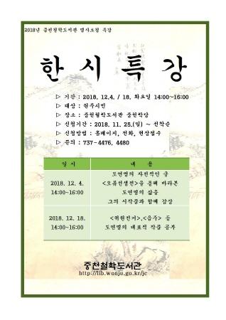 중천철학도서관은 원주시민을 대상으로 오는 12월 4일과 18일 2회에 걸쳐 명사초청 한시 특강을 운영한다.