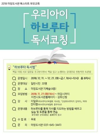 이천 마장도서관은 효율적인 자녀 독서지도를 고민하는 부모들을 위해 북스타트 부모교육 과정으로 "우리아이 하브루타 독서코칭"을 운영한다. 이 과정은 짝을 이뤄 서로 질문을 주고받으면서 공부한 것에 대해 논쟁하는 유대인의 전통적인 토론 독서방법인 ‘하브루타’식 독서 교육이며, 가정에서 자녀들에게 독서지도를 할 수 있는 방법을 가르치는 수업이다.