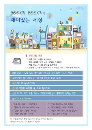 고양시 식사도서관은 2018년 하반기 어린이 독서클럽 프로그램 ‘Book적 Boo적 재미있는 세상’을 오는 27일부터 12월 19일까지 매주 화·수요일 오후 3시 30분에 운영한다.