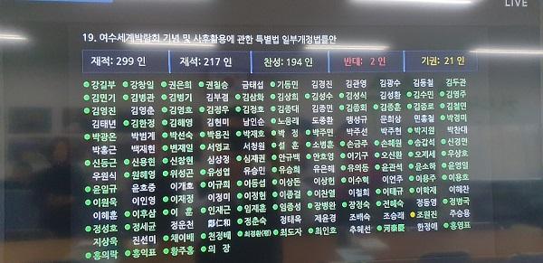 이용주 국회의원이 해양특구 내 국가 및 지자체가 시행하는 시설 조성 근거 마련을 주요골자로 대표 발의한 여수박람회법 개정안이 국회 본회의를 통과하며 엑스포장 사후 활용에 청신호가 켜졌다.