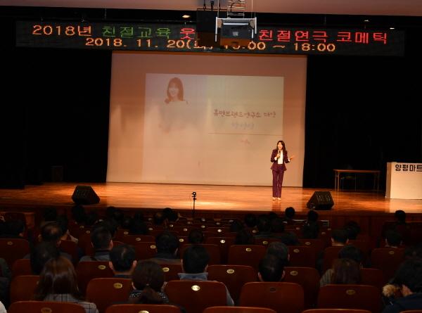 이날 교육은 2018년 공무원 전화친절도 평가 우수 부서로 선정된 농업기술센터 농업지원과를 비롯한 5개부서와 우수 직원 4명을 시상을 시작으로 ‘친절의 가치’라는 주제로 강연이 이어졌다. 특히, ‘양평 톡톡라디오’, ‘앙평마트’, ‘지역개발국 사람들’이라는 코미디 상황극을 통해 코너 별 웃음 속에서 친절의 의미를 찾을 수 있는 시간이 됐다.