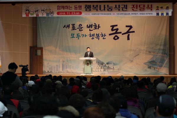 인천 동구 지역사회보장협의체는 23일, 주민행복센터 다목적강당에서 관내 저소득 소외계층 1천명에게 1인당 5만원 상당의 행복나눔식권을 전달했다고 밝혔다.