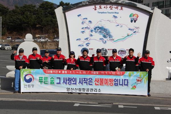 통도사는 우리나라의 삼보사찰인 불보사찰로 연중 신도와 탐방객의 발길이 끊이지 않고, 자연경관이 빼어난 영남알프스를 품고 있어 등산객의 왕래가 잦으며 산불발생위험 취약지역으로 가을철 산불조심기간 산불에 대한 국민적 예방의식과 경각심을 고취시키기 위해 행사를 실시했다. 통도사 산문으로 출입하는 사찰신도 및 탐방객들에게 일일이 산불조심 홍보물을 나눠주고 산불에 대한 경각심과 산림내에서의 화기물 취급 금지를 당부했다.