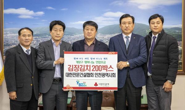 대한전문건설협회 인천광역시회는 지난 22일 ‘희망2019 따뜻한사랑나누기 캠페인’에 동참해 김장김치 200박스를 계양구에 기탁했다.