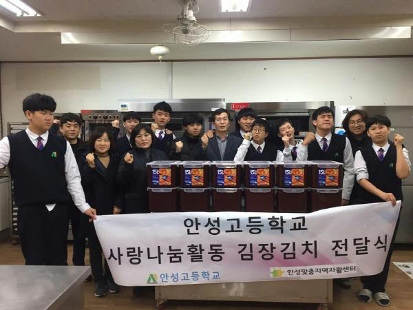 안성고등학교는 겨울 김장 기간을 맞아 안성맞춤자활센터에 직접 담근 김장김치를 기증하는 ‘안성고등학교 사랑나눔 활동 김장김치 전달식’을 지난 21일 안성고등학교에서 가졌다. 이날 전달식에는 안성고등학교 양영모교감과 교직원, 학생을 비롯하여 안성맞춤지역자활센터 직원들이 참석한 가운데 김장김치 50포기를 전달했다.