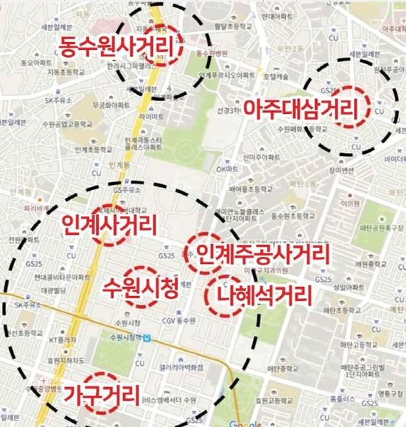 분석 결과 2016년 12월~2017년 3월까지 수원시 도심에서 떼까마귀가 가장 많이 출몰했던 지역은 동수원사거리였고, 인계사거리, 나혜석거리·인계동박스, 가구거리·인계주공사거리, 아주대삼거리가 뒤를 이었다.