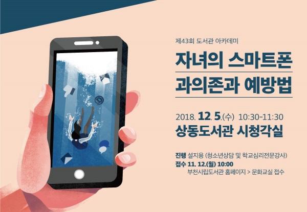 부천시립상동도서관에서는 오는 12월 5일 ‘자녀 스마트폰 과의존 예방과 해소방안’이라는 주제로 제43회 도서관아카데미를 개최한다.