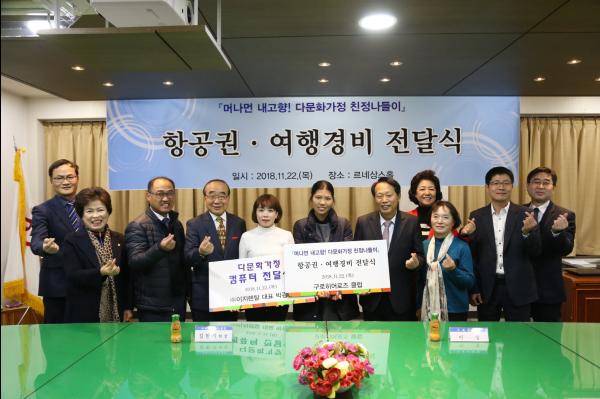 구로구는 22일 구청 르네상스홀에서 환송식을 열고 왕복항공권과 여행경비를 지원가정에 전달했다. 비용은 구로구나눔네트워크 모금액과 구로히어로즈클럽의 후원금으로 마련됐다. 이지렌탈에서 기부한 컴퓨터도 각 1대씩 제공됐다.