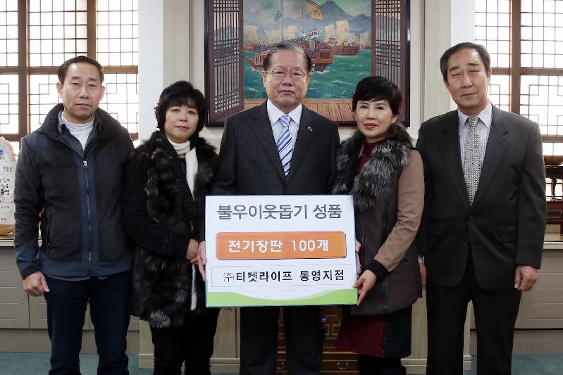 (주)티켓라이프 통영지점(지점장 정은정)과 여러 사업자들이 모은 성금으로 전기요 100장을 마련하여 지난 12월 22일 통영시에 어려운 이웃들을 위한 전기요 100장(환가액 560만원 상당)을 기탁했다.