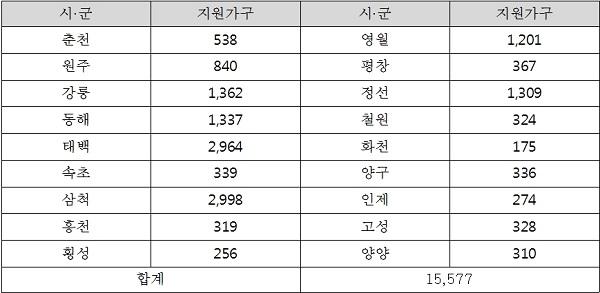 연탄쿠폰 지급사업은 강원도가 저소득층 연탄사용가구 난방비 부담 완화를 위하여 연탄가격 인상에 대한 차액만큼을 연탄쿠폰으로 지원하는 사업으로, 올해 15,577가구에 63억원 상당의 연탄쿠폰을 배부한다.