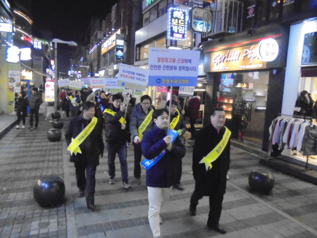 참가자들은 ‘불법광고물 추방’ 어깨띠를 두르고 안양1번가 상가를 순회하며 올바른 광고문화 정착 홍보를 위해 제작한 물티슈를 배포했다.
