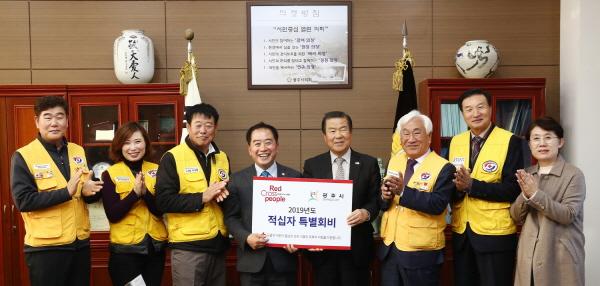 광주시의회는 지난 26일 의장실에서 대한적십자사 경기도지사 김훈동 회장, 박상열 광주시지구협의회장, 윤금영 전국협의회 직전회장, 대한적십자사봉사회 경기도협의회 임원들을 만나 2019년 적십자 특별회비를 전달하며 추운 겨울 따뜻한 나눔의 문화를 전파하는데 동참했다.