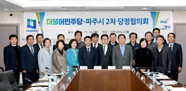 파주시는 지난 26일 파주시청에서 2차 당정협의회를 열고 지역현안 논의 및 내년도 국·도비 예산확보를 위한 공조체계 구축에 나섰다. 이날 당정협의회에는 최종환 파주시장과 윤후덕·박정 국회의원, 도의원, 손배찬 파주시의회 의장을 비롯한 시의원 등이 참석해 예산확보와 지역현안에 대한 의견을 나눴다.