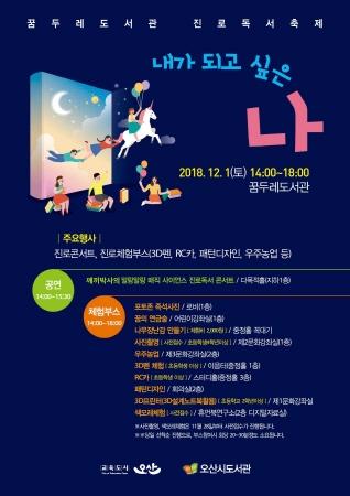 오산시는 오는 12월 1일 세교동에 위치한 꿈두레도서관에서 진로독서축제 "내가 되고 싶은 나"를 개최한다. 이 축제는 학생의 적성과 흥미를 고려한 독서진로 프로그램을 운영하여 학생의 자기주도적 진로설계 능력을 강화하고 맞춤형 진로지도를 통하여 구체적이고 실질적인 진로와 직업을 탐석하고 선택할 수 있는 독서기반 진로탐색능력을 육성하고자 기획됐다.
