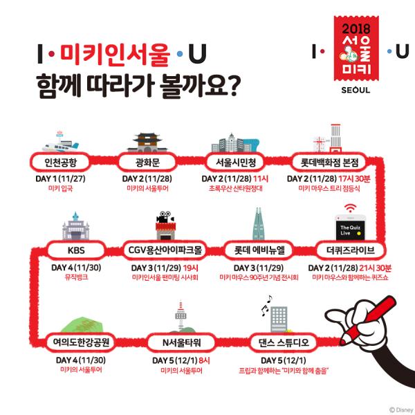 서울시는 디즈니의 대표 아이콘이자 전 세계 아이들의 영원한 친구 미키 마우스가 ‘아이서울유’ 3주년과 ‘미키 마우스’ 90주년 기념 브랜드 콜라보 캠페인으로 28일 서울에 온다고 밝히고 스케줄을 공개했다. 27일 입국해 28일부터 3박4일 간 광화문, 여의도 한강공원, N서울타워 등 서울의 주요 명소를 방문한다.