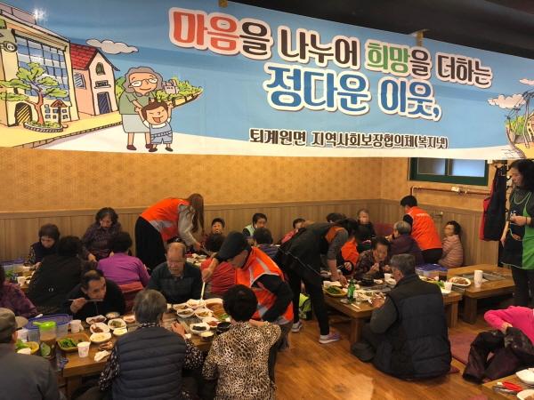 남양주시 퇴계원면 복지넷은 지난 24일 동절기를 맞이하여 독거어르신 40명과 함께 정다운 식사를 나누는 ‘함밥데이’를 가졌다. 함밥데이는 저소득 독거 어르신들과의 식사 나눔을 통하여 외로움을 해소해드리고, 정서적 지지를 전하는 퇴계원면 복지넷의 특화사업이다.
