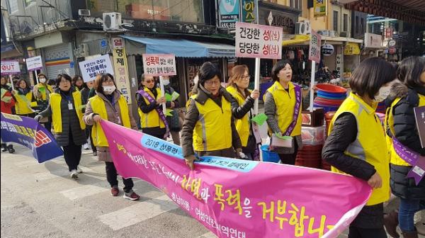 참가자들은 폭력 추방, 불법 영상물 근절 등의 내용이 적힌 피켓을 들고 구호를 외치며 산성시장 일원을 행진했다.