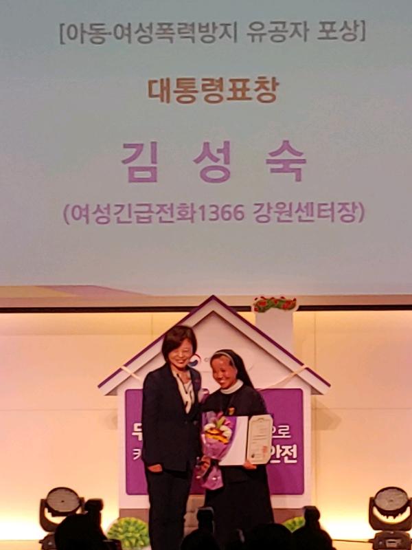 김성숙 여성긴급전화 1366 강원센터장은 27일 오후 2시에 서울 페럼타워에서 열린 "2018년 성폭력·가정폭력 추방주간 기념식"에서 아동여성폭력방지 유공 대통령 표창을 수상했다.