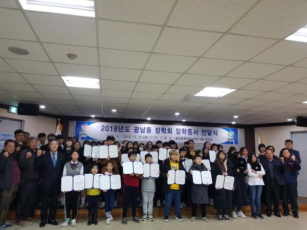 광남동장학회는 지난 27일 광주시 광남동행정복지센터 회의실에서 장학생을 비롯한 장학회 임원, 교사 및 학부모 등 80여명이 참석한 가운데 ‘2018년도 장학증서 전달식’을 개최했다. 이날 장학회는 관내 7개 초·중·고등학교의 추천을 받아 미래를 이끌어갈 열정과 가능성이 있는 청소년 95명을 선발해 총 2천570만원을 전달했다.