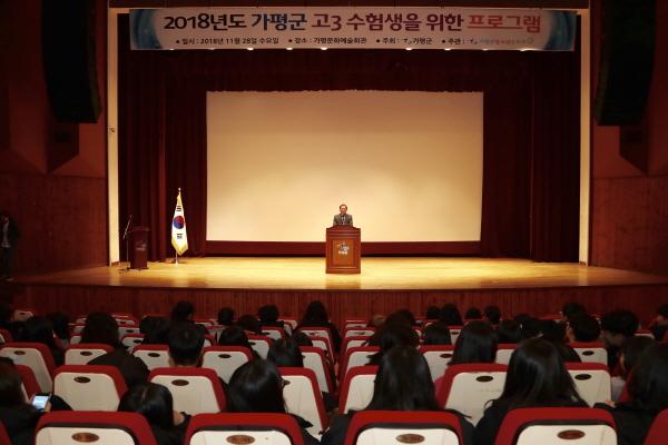 가평군은 28일 가평문화예술회관에서 고3 수험생을 위한 유쾌한 치유의 축제를 마련해 새로운 미래에 도전의욕을 다지는 계기를 마련했다.