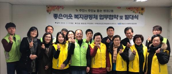화성시 병점 2동이 소규모 복지 공동체의 첫 모델로 지난 27일 태안6단지 관리사무소에서 ‘좋은 이웃 복지공동체’업무협약 및 봉사단 발대식을 개최했다. 좋은 이웃 복지공동체는 지역이 가진 복지 문제를 지역사회와 공동으로 대처하고자 마을 공동체를 결성하고, 주민이 직접 도움이 필요한 이웃을 보살필 수 있도록 지원하는 사업이다.