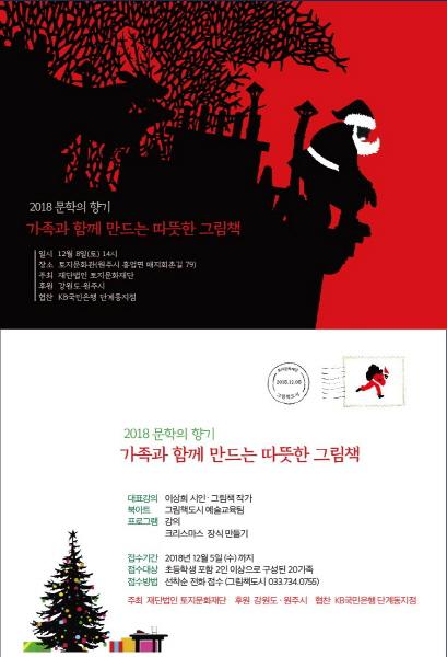 토지문화재단이 오는 12월 8일 오후 2시 토지문화관에서 2018 문학의 향기 세 번째 프로그램 ‘가족과 함께 만드는 따뜻한 그림책’ 강좌를 연다.