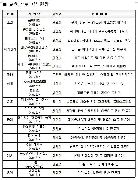 주니어 평생학습의 일환으로 사회에 첫발을 내딛는 새내기들에게 취미 및 교양강좌 등을 접할 기회를 만들어 주기 위한 이번 행사는 자기관리, 교양, 취미, 공예, 운동 등 사회교육 프로그램 18개 강좌를 선정해 진행된다.