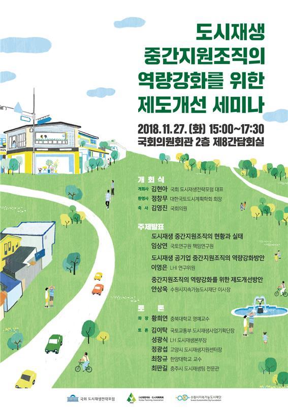 수원시지속가능도시재단은 도시재생 뉴딜사업의 3년차를 앞둔 상황에서 현장에서 사업의 실현 가능성을 지원하는 중간지원조직의 현황을 파악하고, 제도개선 방안 마련을 위하여 ‘도시재생 중간지원조직의 역량강화를 위한 제도개선 세미나’를 지난 27일 국회의원회관 제8간담회실에서 개최했다.