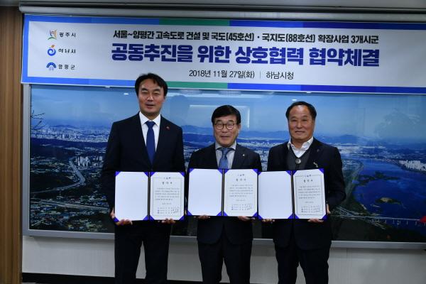 양평군은 광주시, 하남시와 연계되는 서울~양평간 고속도로 건설 및 국도·국지도 확장사업 등에 대하여 3개 시·군이 공동 대응 추진키로 협의하고, 지난 27일 하남시청에서 시장·군수간 상호협력 업무협약을 체결했다. 이번 협약식은 3개 시·군이 연계되는 국책 도로사업 추진에 한 목소리로 대응하여 사업을 가속하기 위하여 추진됐다.
