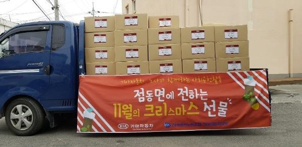 기아자동차와 전국금속노동조합 기아자동차지부는 지난 27일 점동면에 2천만원 상당의 먹거리 꾸러미와 이불세트를 기탁했다.