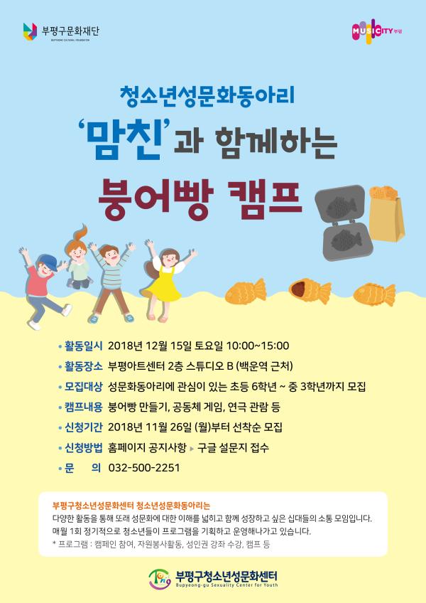 부평구 청소년성문화센터는 청소년 성문화동아리 ‘맘이 통하는 친구와 함께하는 붕어빵 캠프’에 참여할 청소년들을 모집한다.