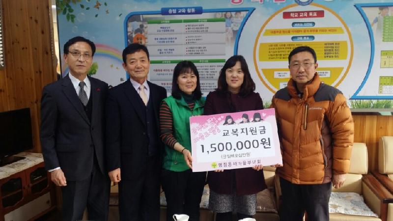 통영시 명정동새마을부녀회(회장 김수진)에서는 지난 23일 충렬초등학교를 방문하여 2016년 중학교에 입학하는 신입생중 가정형편이 어려운 저소득 학생들을 위한 교복지원금 150만원을 기탁했다.