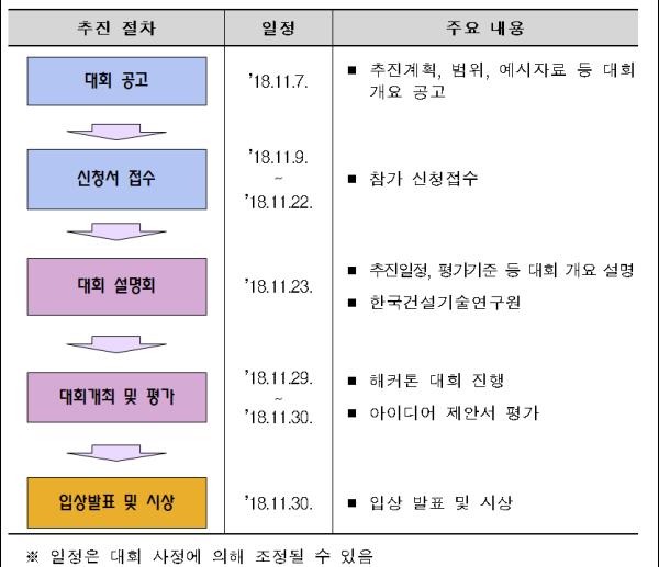 참가자 모집은 지난 9일부터 22일까지 신청서를 통해 접수하였으며, 총 17개 팀 63명이 신청했다. 해당 팀을 대상으로 23일 한국건설기술연구원에서 대회 일정과 제안서 작성 요령 등에 대한 설명회를 개최했다.