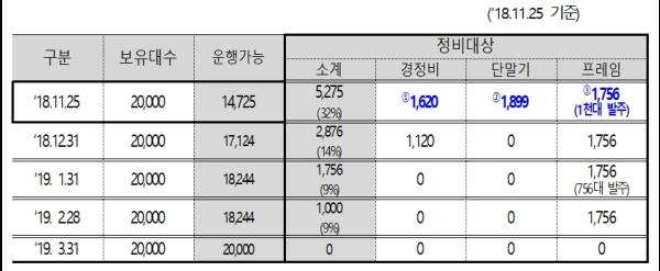 25일 기준 따릉이 보유대수는 2만대이며 각종 고장으로 운행하지 못하는 정비대상인 따릉이는 5,275대로 전체의 32%가 고장으로 운행하지 못하고 있다. 정비대상 중에 단말기 고장은 1,899건으로 가장 많다.