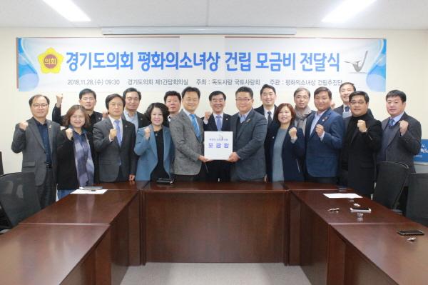 경기도의회 독도사랑 국토사랑회는 오는 12월 14일 의회에 건립예정인 평화의소녀상 모금운동에 동참을 선언하고 28일 평화의소녀상 건립추진단과의 모금비 전달식을 경기도의회 3층 제1간담회의실에서 가졌다.