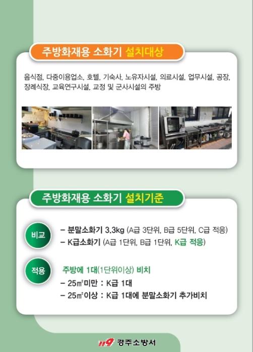 경주소방서(서장 안태현)는 소화기구 등의 화재 안전기준이 개정·시행 됨에 따라 주방에서 식용유로 인한 화재발생시 사용가능한 ‘주방화재용 K급 소화기’를 의무적으로 비치해 줄 것을 당부했다.