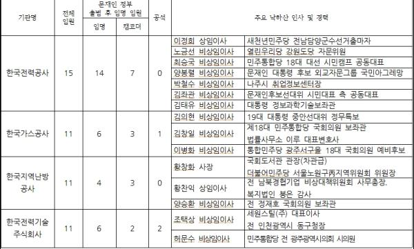 또한 한국전력공사의 경우도 문재인 정부에서 임명된 임원 14명 중 7명이 캠코더인사로 분류되었으며, 나주시 취업정보센터장을 맡은 박철수 사외이사의 경우는 그야말로 지역주민을 상장회사의 임원으로 취업시킨 능력보다는 지역 연고를 중시한 무리한 인사였던 것으로 확인됐다.