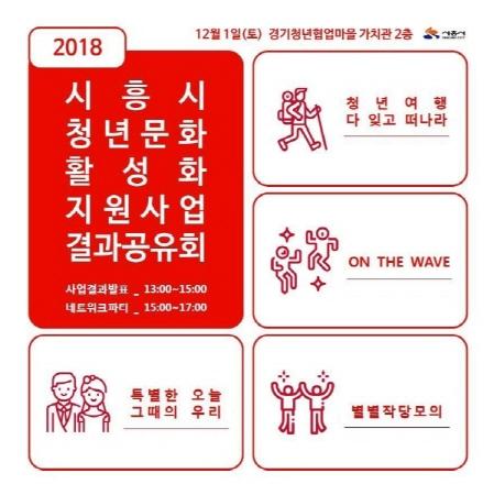 시흥시는 문화예술 청년단체를 지원하는 "2018 청년문화 활성화 지원사업"의 결과공유회를 오는 12월 1일 오후 1시에 경기청년협업마을 가치관 2층에서 개최한다. 올해 3회를 맞이하는 결과공유회는 청년문화 활성화 지원사업에 선정된 총 4개의 청년단체의 창의적인 문화예술프로젝트의 결과물을 공유하는 자리이다.
