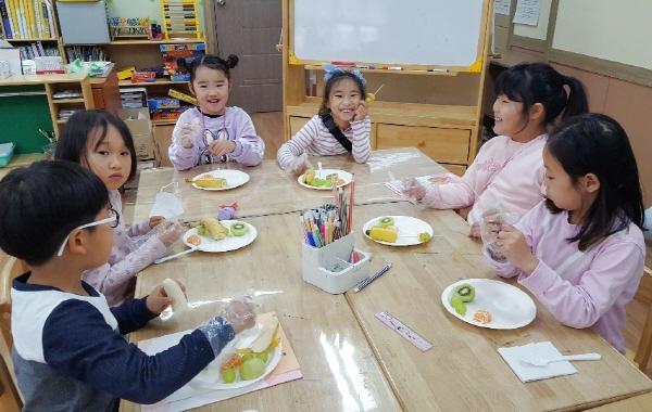 동곡초, 도원초, 오정초, 중흥초 등 4개 학교를 대상으로 지난 10월부터 11월까지 학교별 2회씩 미각체험놀이를 진행했다. 키위, 귤, 바나나, 포도 등 과일 4종과 파프리카, 당근, 오이, 양상추, 방울토마토 등 채소 5종을 이용해 건강한 간식을 탐색하고 후각, 청각, 촉각, 미각, 시각으로 표현해보는 오감체험교육으로 이뤄졌다.