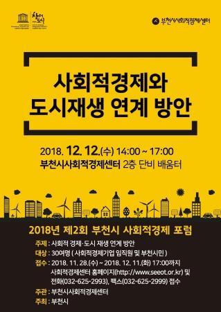 부천시는 오는 12월 12일 부천시사회적경제센터 배움터에서 ‘2018년 제2회 부천시 사회적경제 포럼’을 개최한다. 이번 포럼은 정부의 사회적경제 정책기조인 사회적경제와 도시재생, 사회적경제와 공유경제의 융합 모델에 대한 인식을 확산하기 위해 기획됐다.