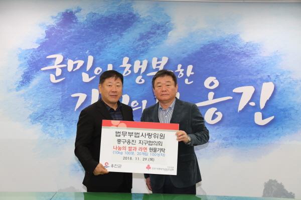 옹진군은 29일 법무부 법사랑위원 중구옹진지구 협의회에서"희망2019나눔캠페인 옹진군 따뜻한 사랑나누기"동참과 지역의 어려운 이웃을 위한 쌀 100포와 라면 100상자를 기탁했다고 밝혔다.