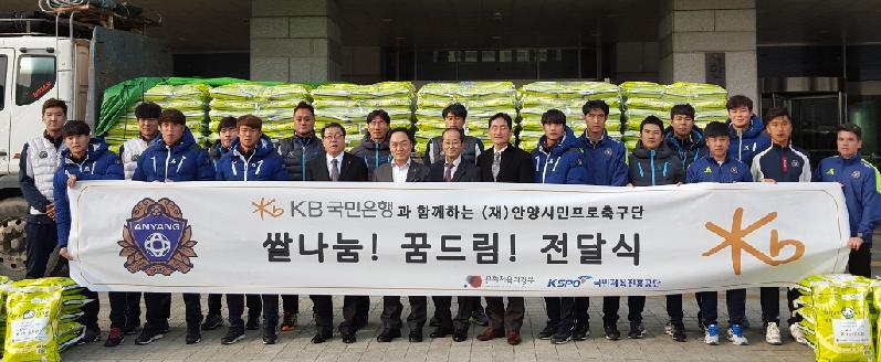 지난해 K리그 대상에서 사랑 나눔상을 수상한 FC안양은 지난 24일 오후 안양시청에서 FC안양 이필운 구단주, FC안양 김기용 단장, 김정수 만안구청장, 김명철 동안구청장 등이 모인 가운데 KB국민은행과 함께하는 쌀나눔 꿈드림 행사로 적립된 평택 슈퍼오닝 쌀 12톤 전달식을 완료했다.