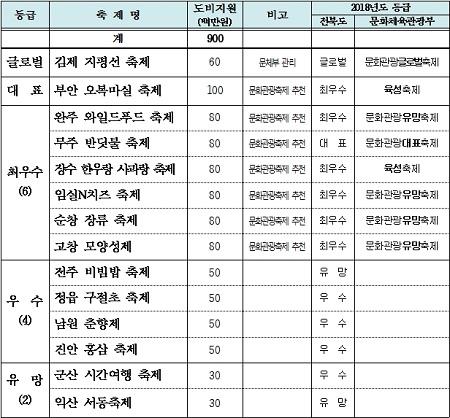 또 6개의 최우수축제로 ‘완주와일드푸드축제’,‘무주반딧불축제’,‘장수한우랑사과랑축제’,‘임실N치즈축제’,‘순창장류축제’,‘고창모양성제’가 선정됐으며, 우수축제로 ‘전주비빔밥축제’,‘정읍구절초축제’,‘남원춘향제’,‘진안홍삼축제’ 등 4개가 선정됐다. 마지막 등급인 유망축제는 ‘군산시간여행축제’와 ‘익산서동축제’다.