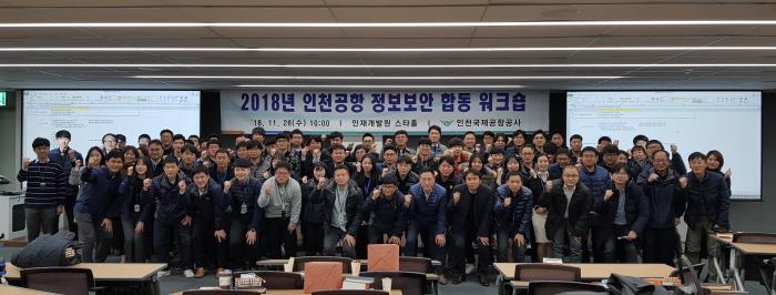 | - 28일 인천공항공사 인재개발원에서 열린 인천공항공사, 자회사, 협력사 합동 정보보호 워크숍에서 참가자들이 기념촬영을 하고 있다. |