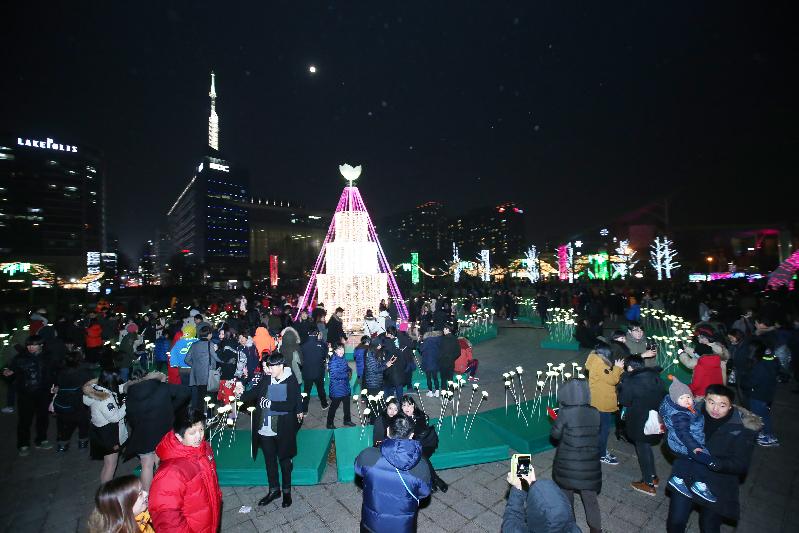 | 크리스마스 이브인 지난 24일 호수공원 광장에 대형 크리스마스트리 빛 조형물이 연말연시 분위기를 고조시키는 가운데 꽃빛축제를 구경 나온 시민들로 북적이고 있다. |